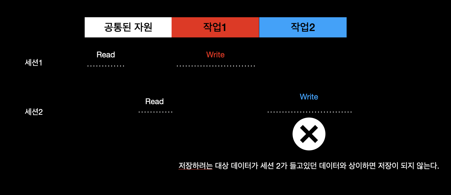 - 세션 2가 들고 있는 공통 자원의 Version이, 저장하려는 공통 자원은 Version과 같은지 체크가 필요