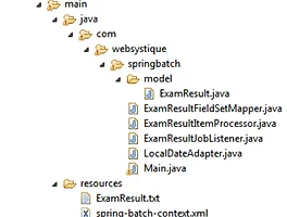 <project xmlns="http://maven.apache.org/POM/4.0.0" xmlns:xsi="http://www.w3.org/2001/XMLSchema-instance" xsi:schemaLocation="http://maven.apache.org/POM/4.0.0 http://maven.apache.org/xsd/maven-4.0.0.xsd"> <modelVersion>4.0.0</modelVersion> <groupId>com.websystique.springbatch</groupId> <artifactId>SpringBatchMultiReaderHibernateWriter</artifactId> <version>0.0.1-SNAPSHOT</version> <packaging>jar</packaging> <name>SpringBatchMultiReaderHibernateWriter</name> <url>http://maven.apache.org</url> <properties> <springframework.version>4.0.6.RELEASE</springframework.version> <springbatch.version>3.0.1.RELEASE</springbatch.version> <hibernate.version>4.3.6.Final</hibernate.version> <javassist.version>3.18.1-GA</javassist.version> <mysql.connector.version>5.1.31</mysql.connector.version> <joda-time.version>2.3</joda-time.version> <c3p0.version>0.9.5-pre8</c3p0.version> </properties> <dependencies> <!-- Spring Core --> <dependency> <groupId>org.springframework</groupId> <artifactId>spring-core</artifactId> <version>${springframework.version}</version> </dependency> <dependency> <groupId>org.springframework</groupId> <artifactId>spring-tx</artifactId> <version>${springframework.version}</version> </dependency> <!-- Spring ORM support --> <dependency> <groupId>org.springframework</groupId> <artifactId>spring-orm</artifactId> <version>${springframework.version}</version> </dependency> <!-- Spring Batch --> <dependency> <groupId>org.springframework.batch</groupId> <artifactId>spring-batch-core</artifactId> <version>${springbatch.version}</version> </dependency> <dependency> <groupId>org.springframework.batch</groupId> <artifactId>spring-batch-infrastructure</artifactId> <version>${springbatch.version}</version> </dependency> <!-- Hibernate related dependencies --> <dependency> <groupId>org.hibernate</groupId> <artifactId>hibernate-core</artifactId> <version>${hibernate.version}</version> </dependency> <dependency> <groupId>org.javassist</groupId> <artifactId>javassist</artifactId> <version>${javassist.version}</version> </dependency> <!-- Joda-Time --> <dependency> <groupId>joda-time</groupId> <artifactId>joda-time</artifactId> <version>${joda-time.version}</version> </dependency> <!-- To map JodaTime with database type --> <dependency> <groupId>org.jadira.usertype</groupId> <artifactId>usertype.core</artifactId> <version>3.0.0.CR1</version> </dependency> <!-- MySQL --> <dependency> <groupId>mysql</groupId> <artifactId>mysql-connector-java</artifactId> <version>${mysql.connector.version}</version> </dependency> <!-- ComboPooledDataSource --> <dependency> <groupId>com.mchange</groupId> <artifactId>c3p0</artifactId> <version>${c3p0.version}</version> </dependency> <dependency> <groupId>junit</groupId> <artifactId>junit</artifactId> <version>3.8.1</version> <scope>test</scope> </dependency> </dependencies> <build> <pluginManagement> <plugins> <plugin> <groupId>org.apache.maven.plugins</groupId> <artifactId>maven-compiler-plugin</artifactId> <version>3.2</version> <configuration> <source>1.6</source> <target>1.6</target> </configuration> </plugin> </plugins> </pluginManagement> </build> </project>